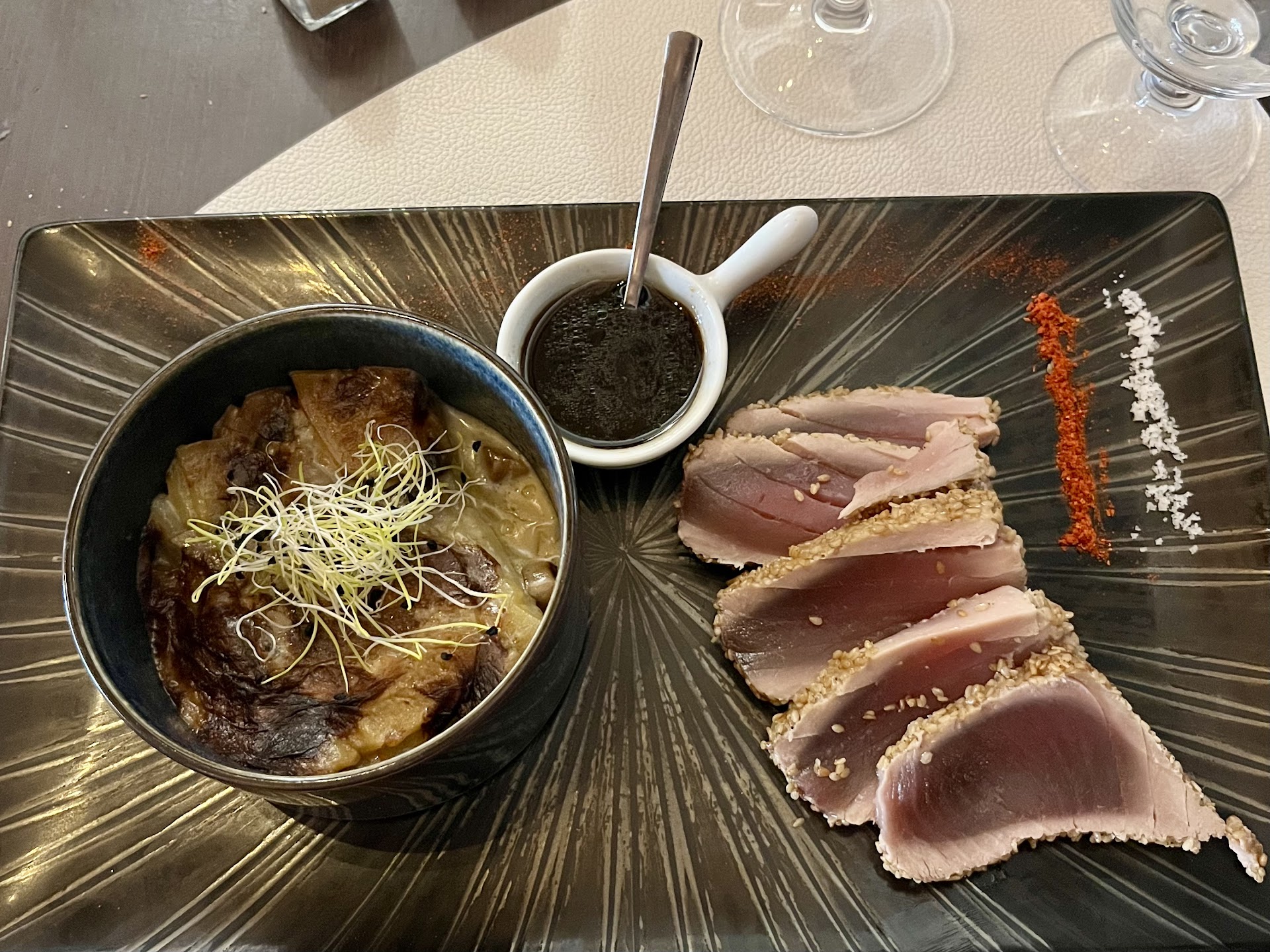"Mes parents deviennent des habitués dc j’ai suivi. Très bon restaurant, propre, joliment décoré. Le service était très agréable et efficace et les plats délicieux. Ceviche, dorade du jour, faux-filet et profiteroles ! Il y avait du monde en ce week-end de l’Ascension mais tout s’est bien déroulé."