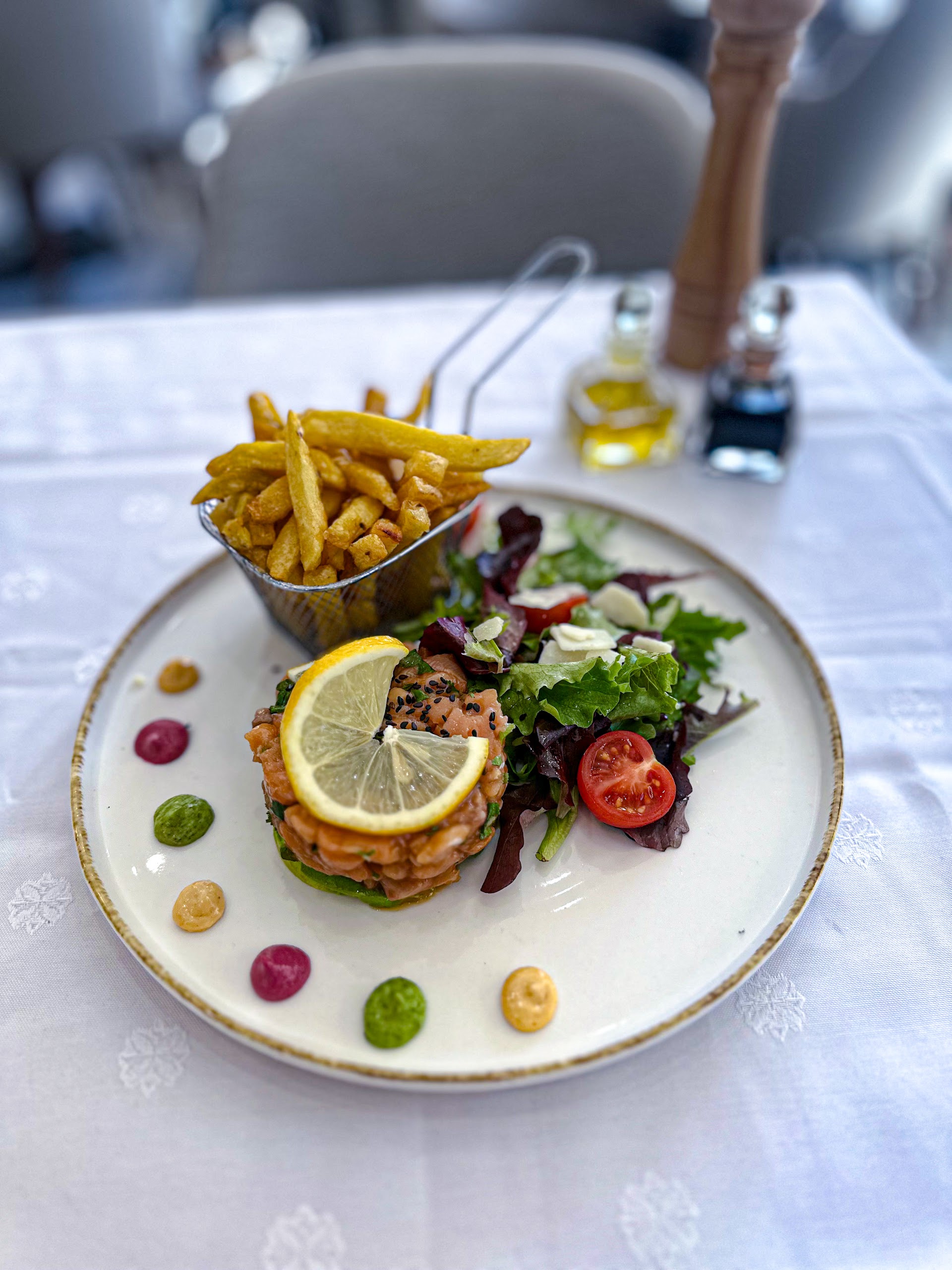 "Nous sommes venus manger deux fois dans ce restaurant oĂč l'on a toujours Ă©tĂ© bien accueilli par un personnel vraiment au top. La cuisine est vraiment parfaite, le service est assez rapide et le rapport qualitĂ© prix est vraiment trĂšs bon. J'ai vraiment adorĂ© la salade seguin, mĂȘme si tout est top."