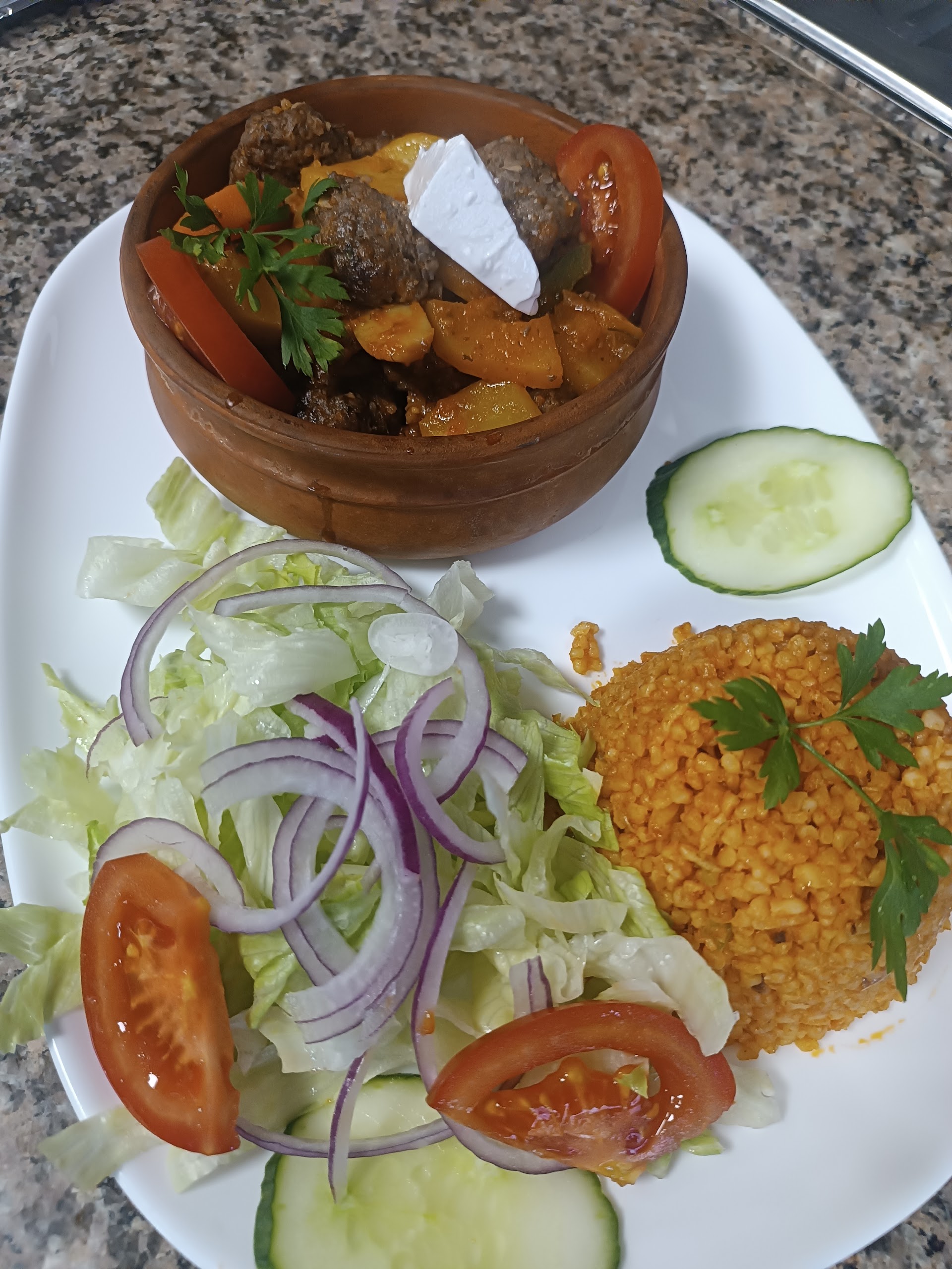 "Jâai choisi une assiette avec kebab, frites et blĂ©, accompagnĂ©e de cruditĂ©s : un vrai rĂ©gal ! La sauce blanche Ă©tait Ă disposition, et jâai bien lâimpression que le pain est fait maison. Tout Ă©tait excellent, le prix plus que correct, et nous avons Ă©tĂ© servis trĂšs rapidement!"