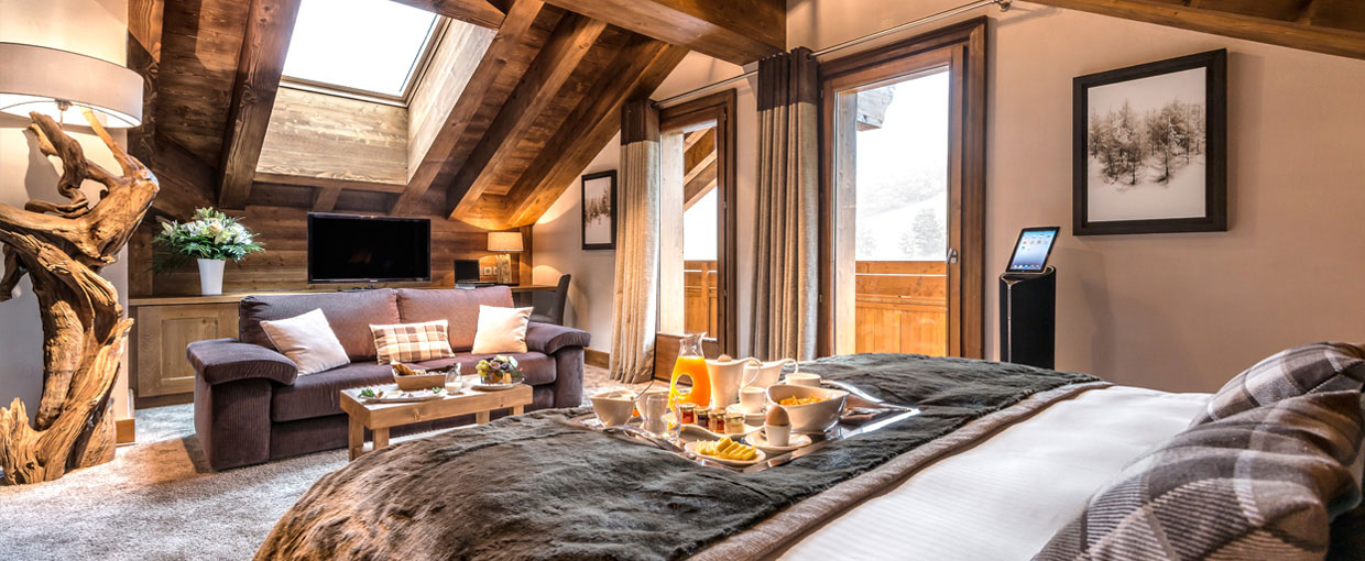 Hôtel rustique chic au pied des pistes proposant restaurant élégant, piscine intérieure et spa.