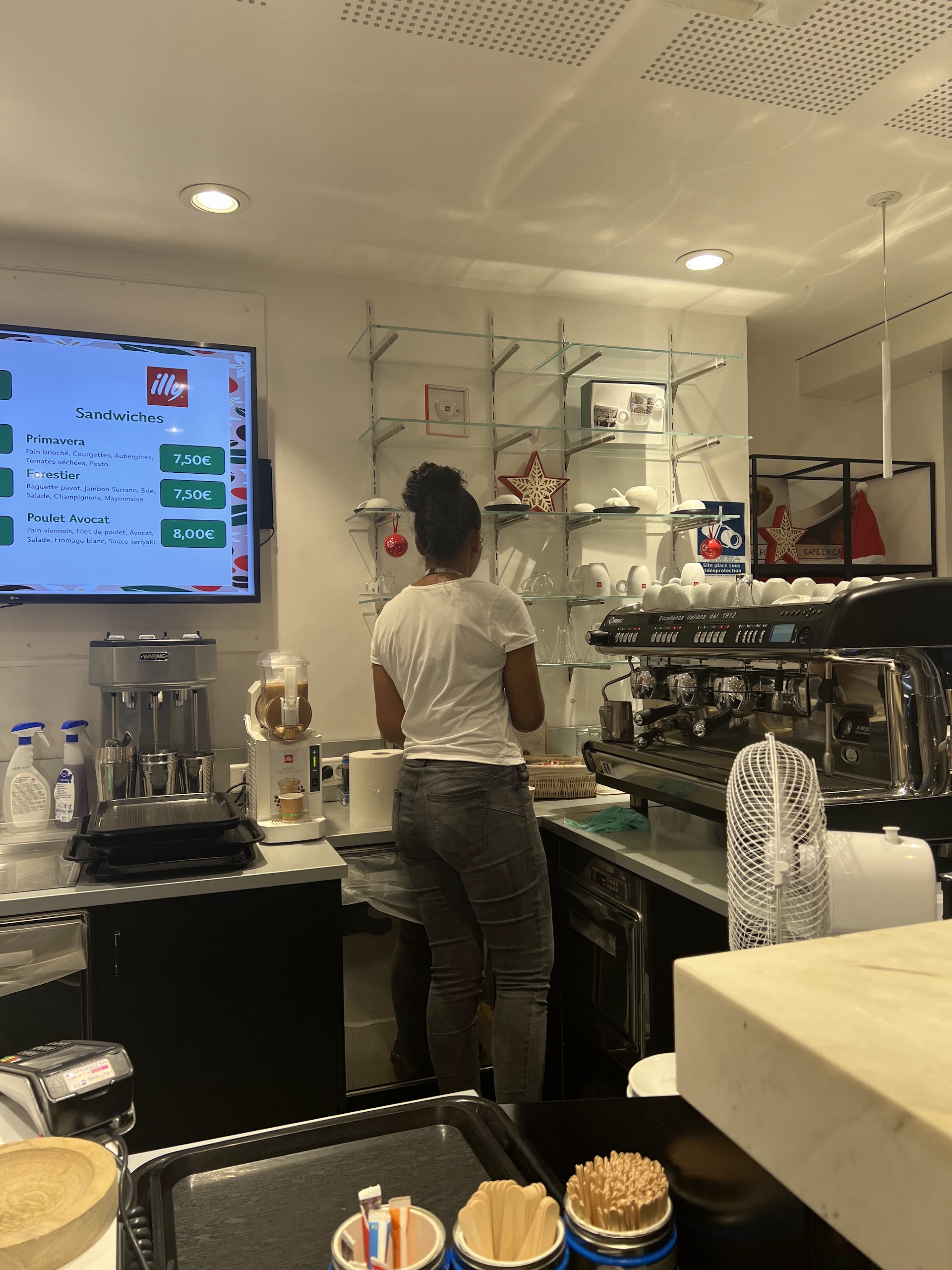 "TrĂšs bon service, la vendeuse Ă©tait adorable ! Pour deux cafĂ© (un petit serrĂ© et un cappuccino) il faut compter 5-6âŹ."