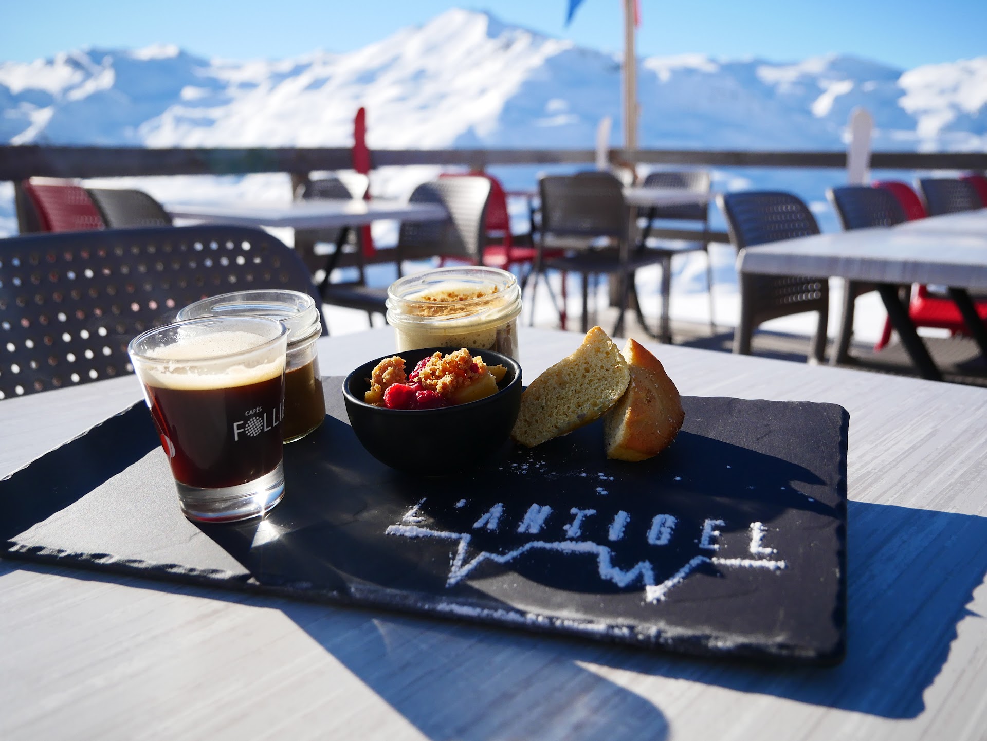 "Nous y avons pris des desserts, c'était super bon. Le tiramisu était bien présenté. La vue est magnifique, elle donne sur la montagne, le personnel est agréable et le lieu est propre, chaleureux et sympathique. Je recommande."