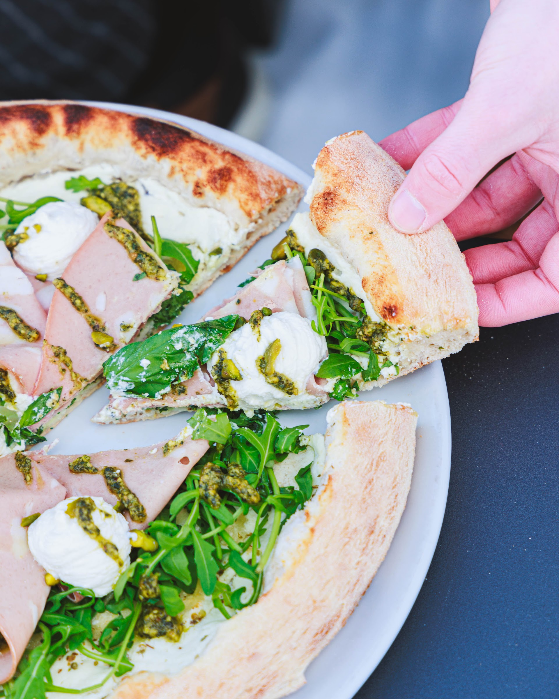 Restaurant rustique chic servant pizzas, grillades et vin dans chalet moderne avec terrasse.