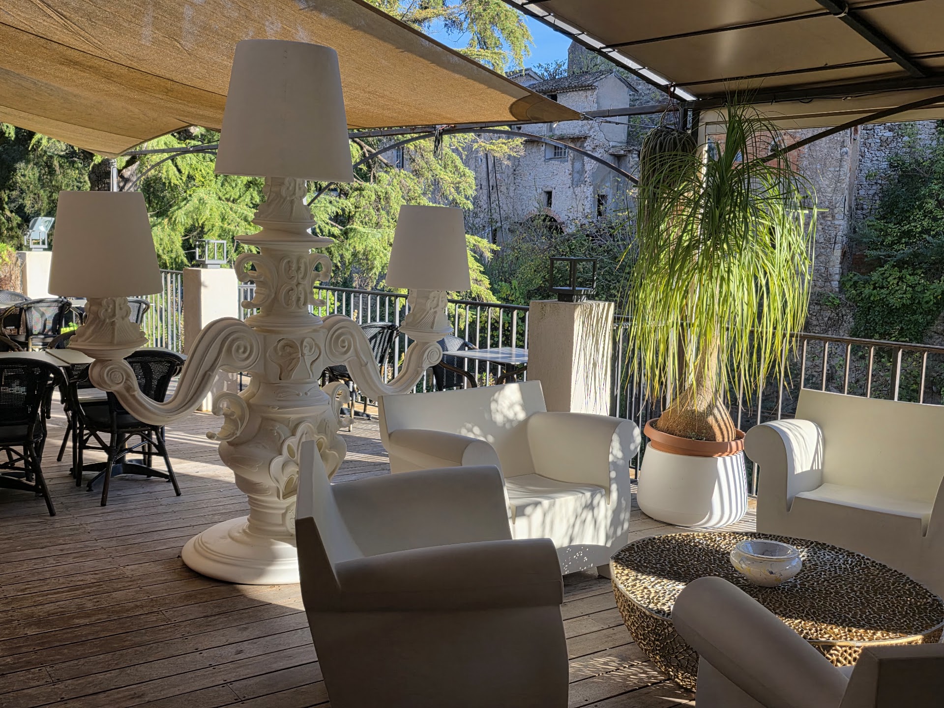 Cuisine raffinée aux accents du Sud dans une grotte dotée d'un lustre élégant et dominant des cascades.